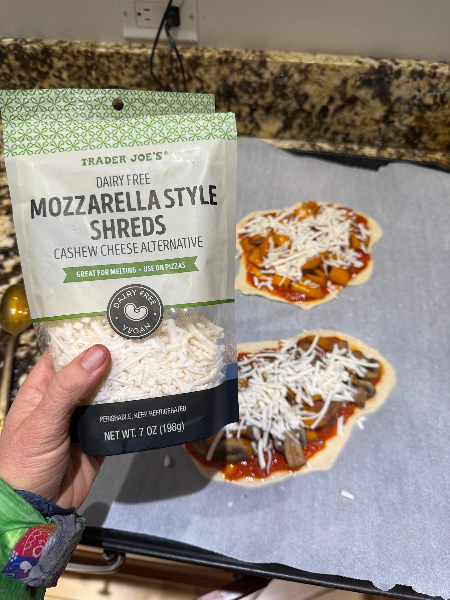 Aaron and I have also continued with our plant based whole food diet — because we’ve genuinely loved it, so I decided to test out these dairy free mozzarella shreds from Trader Joe’s: