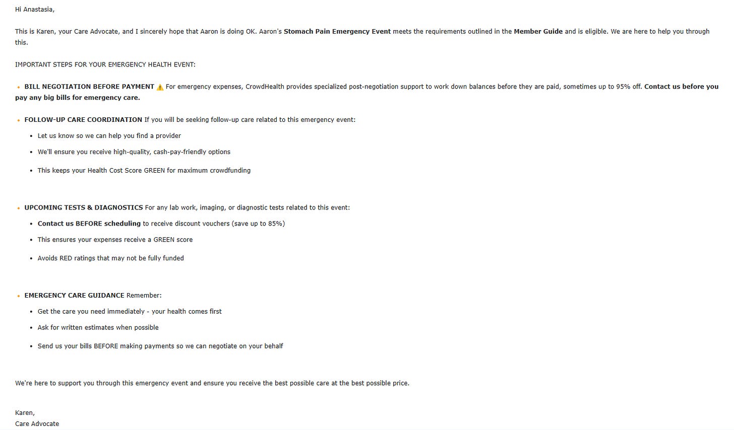 There are around 15,000 members (maybe more?) of the Crowd right now, and each time a member needs funding for something, requests are sent out to members to help fund various health-related issues — including major surgeries, cancer, injury, pregnancy, illness, etc… All of the things that normal health insurance would (partially) cover.