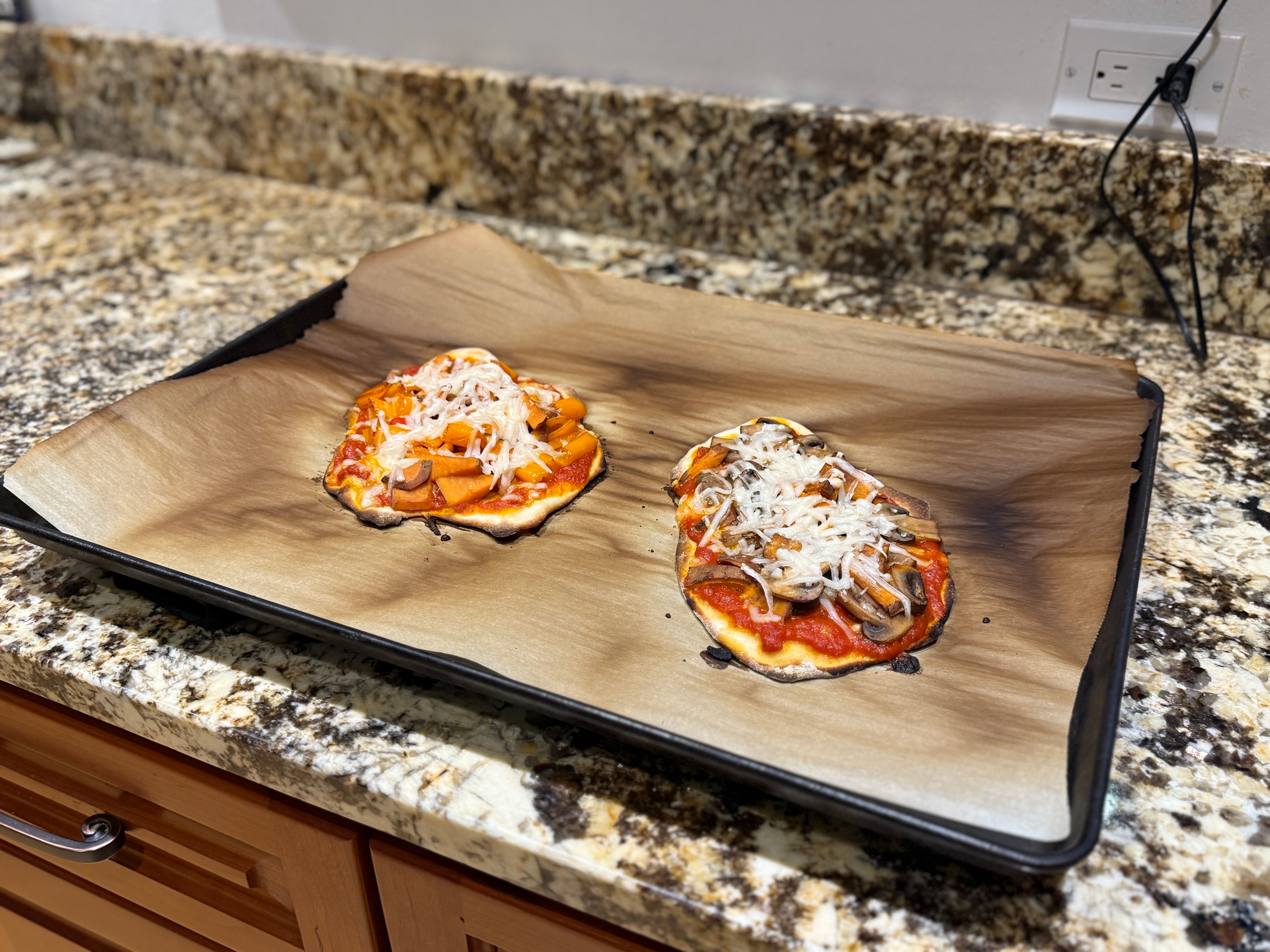 Aaron’s pizza is on the left… sweet potato and roasted peppers… and mine is on the right… mushroom and sweet potato!